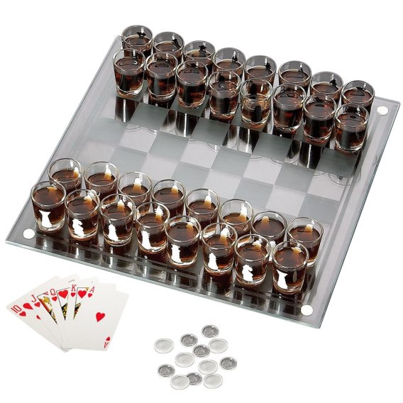Zestaw do gry w szachy z kieliszkami zamiast pionków oraz z dodatkami.